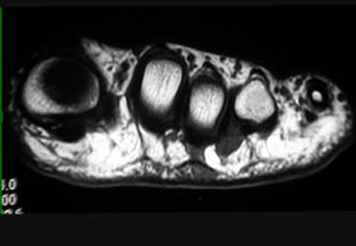 Resonancia magnética donde se evidencia el neuroma en el 3er. espacio intermetatarsiano.